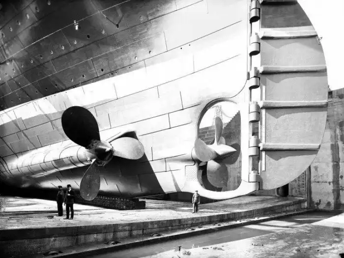 Титаник в сухом доке. Здесь Вы видите масштаб человека, стоящего рядом с одним из пропеллеров, 1912 год.