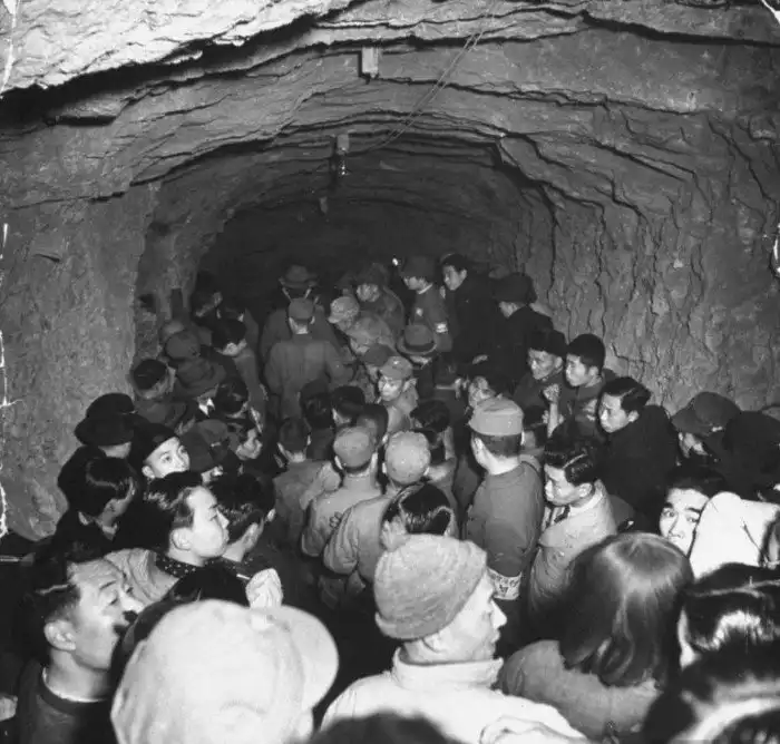Люди, входящие в кустарное бомбоубежище. Чунцин, Китай, 1939.