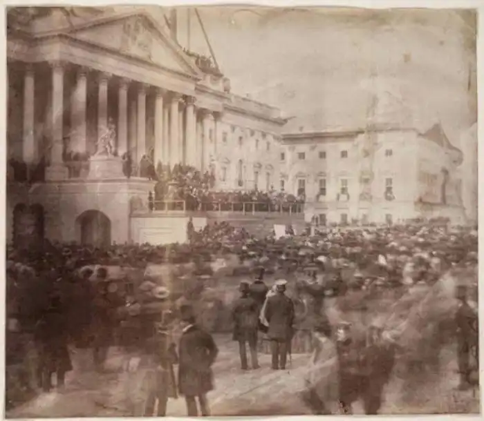 Первая опубликованная фотография инаугурации президента, сделанная в 1857 году во время торжественной клятвы Джеймса Бьюкенена.