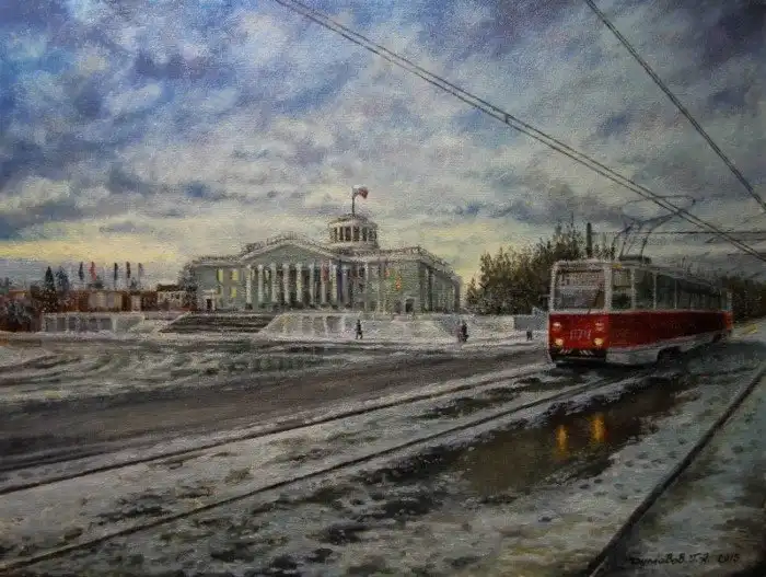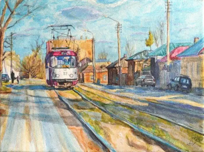 «Весенний трамвай» (Тула, улица Епифанская, весна 2015) — холст, акрил. Дима Гура (род. 1972)