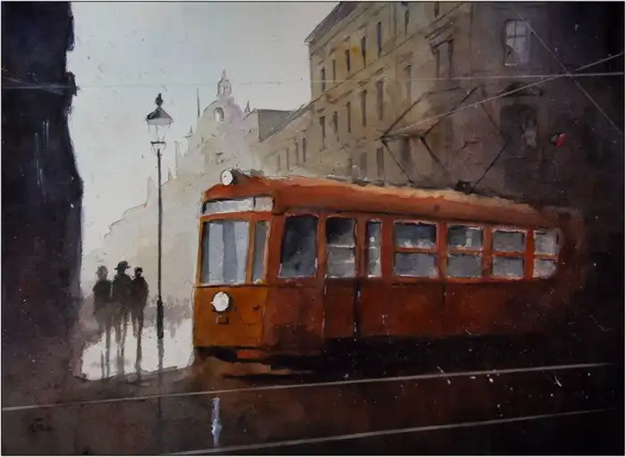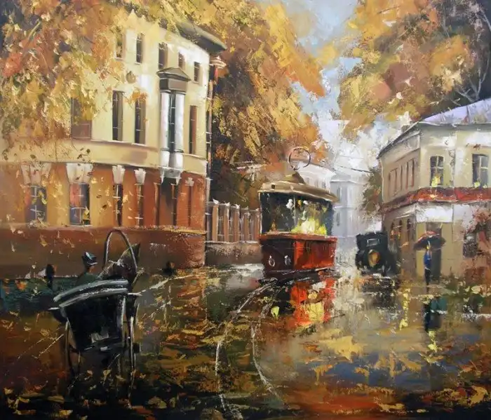 «Первый трамвай» — масло, холст. Олег Рауба (род. 1956).