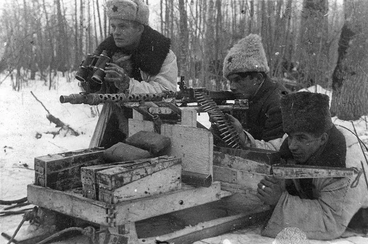 Расчет трофейного 7,92-мм пулемета MG-34 установленного на санях. Партизанский отряд.
