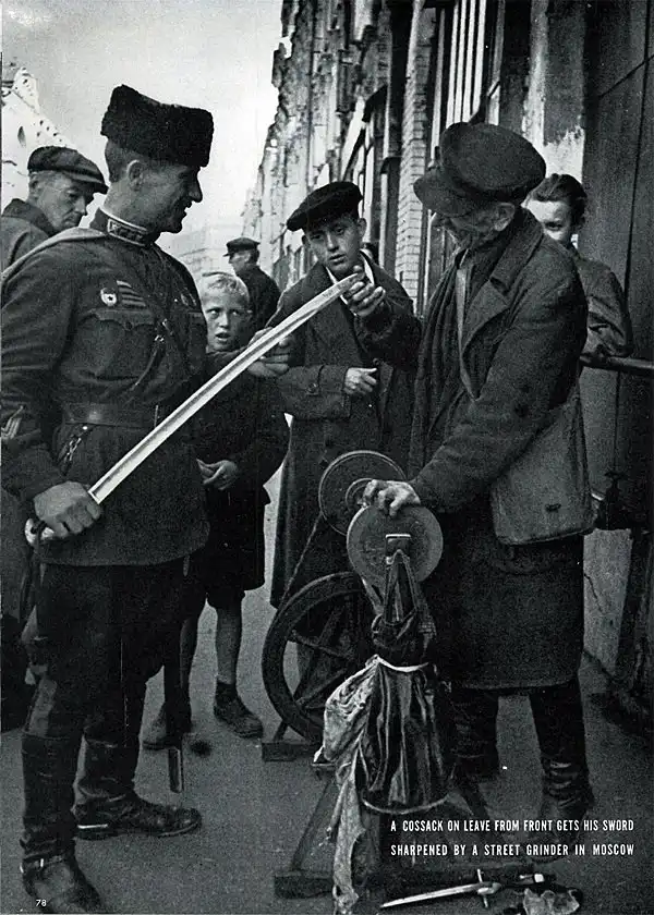 Фото из журнала "Life" 1942 года, оригинальная подпись: "Вернувшийся с фронта казак затачивает свой меч у уличного точильщика, Москва".
