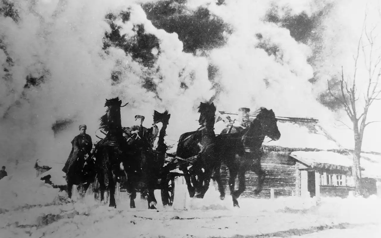 Тачанка и конники 2-го гвардейского кавалерийского корпуса на марше по улице населенного пункта во время контрнаступления советских войск под Москвой. СССР. Январь 1942 года.