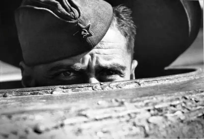 Наводчик советского танка выглядывает из люка своего танка во время битвы за Берлин. Третий Рейх. Апрель 1945 года.