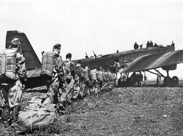 Советские парашютисты-десантники грузятся в бомбардировщик ТБ-3 на Северо-Кавказском фронте. 1943 год.