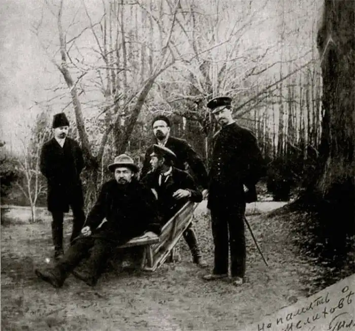 В тачке - А.П. Чехов и М.П. Чехов. Везёт тачку В.А. Гиляровский. Стоят: слева - А.А. Долженко, справа - И.П. Чехов. Усадьба в Мелихово, 1892 год.