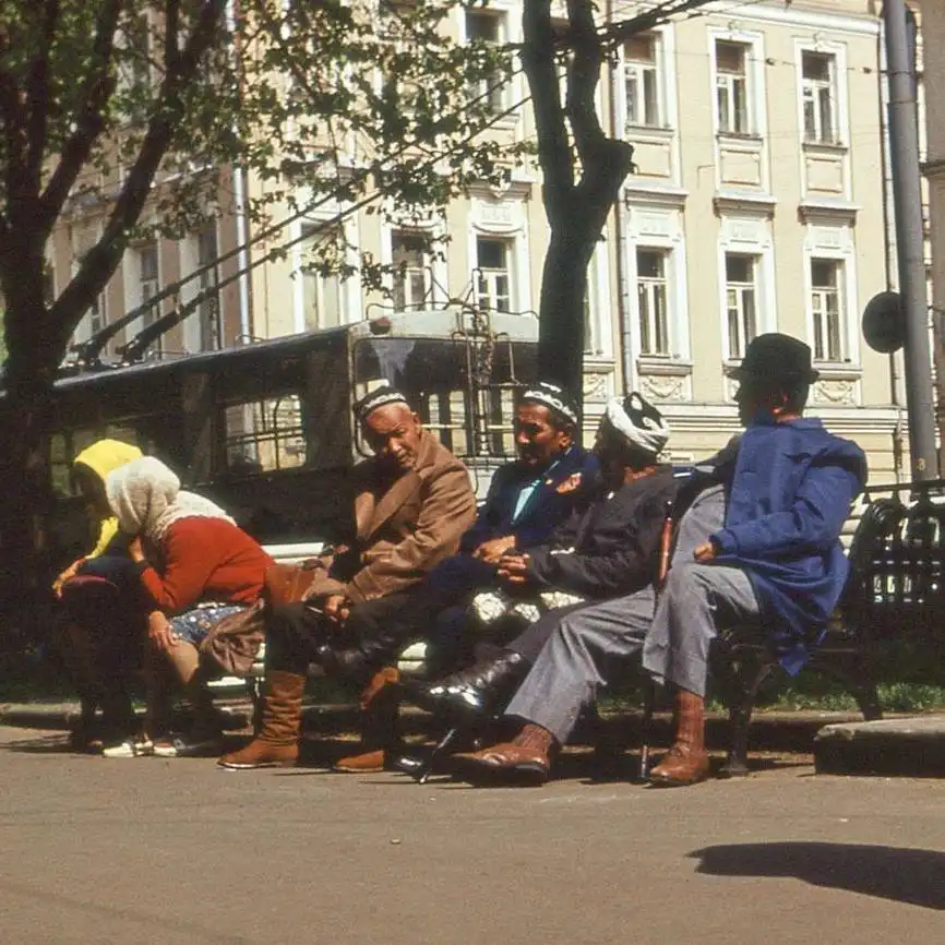 На Неглинной, на бульваре. На заднем плане - Нижний Кисельный переулок. Тюбетейки, сапоги козловые. А рядом ресторан "Узбекистан".