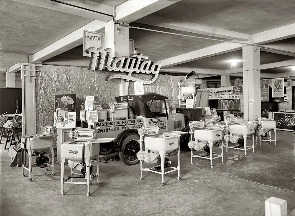 Электрические стиральные машины производства фирмы Maytag на выставке-продаже бытовой техники; Вашингтон, 1926 год.