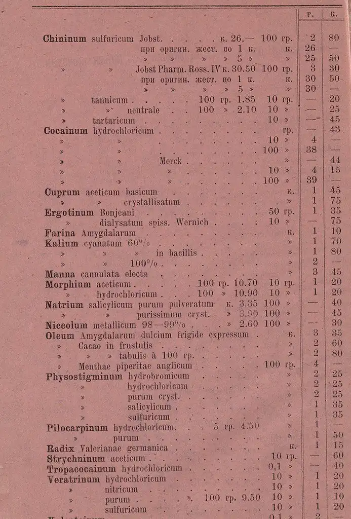 Прейскурант на кокаин, 1900 год. 38 рублей за 100 грамм.