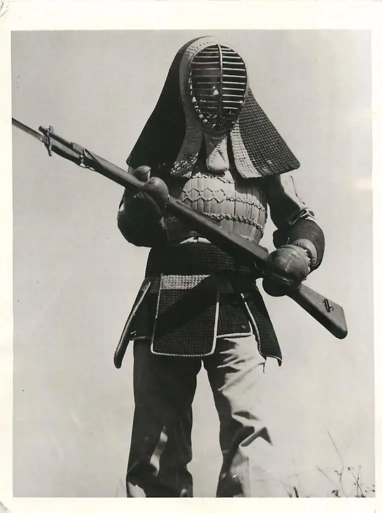 Американский солдат в костюме, используемом японскими солдатами для отработки штыкового боя. Кваджалейн, 1944 год.