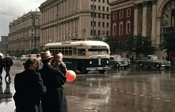 На улицах Москвы, 1956 г., фотограф Семён Фридлянд На таких троллейбусах я ещё успел покататься, в детстве. Очень интересная машина в правой части кадра. "Победа" в грузовом варианте? Никогда такого не видел.