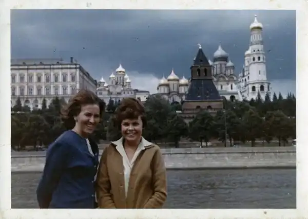 Две девушки на фоне Кремля, 1966 г. Одна из них англичанка, другая москвичка.