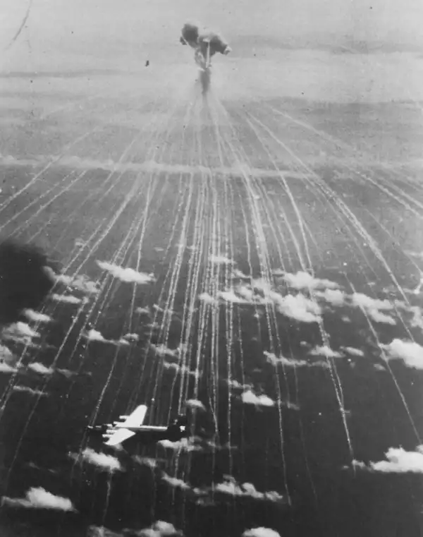 Взрыв японской фосфорной противоавиационной бомбы тип 99 kai3 модель 3 над американским тяжелым бомбардировщиком B-24 «Либерейтор» (Consolidated B-24 Liberator). Бомбы этого типа сбрасывались с истребителей-перехватчиков императорского флота Японии.