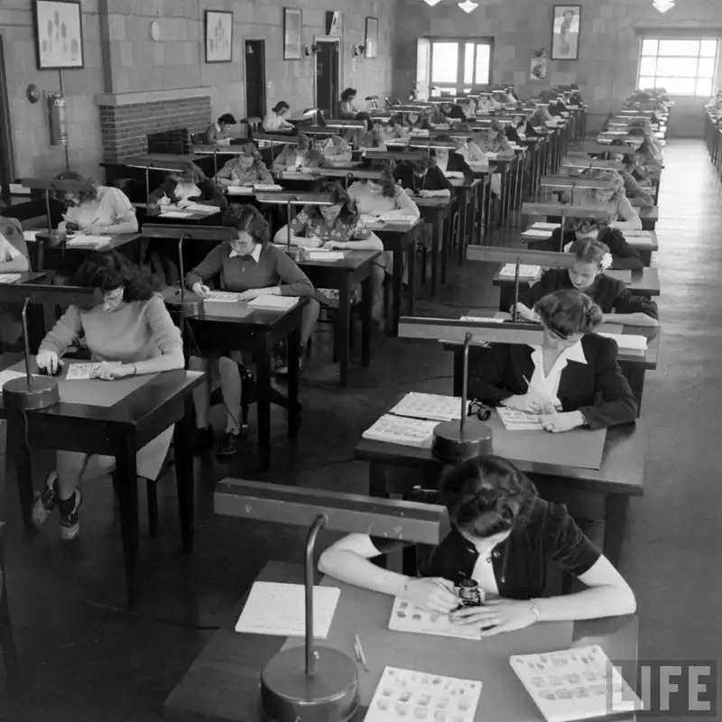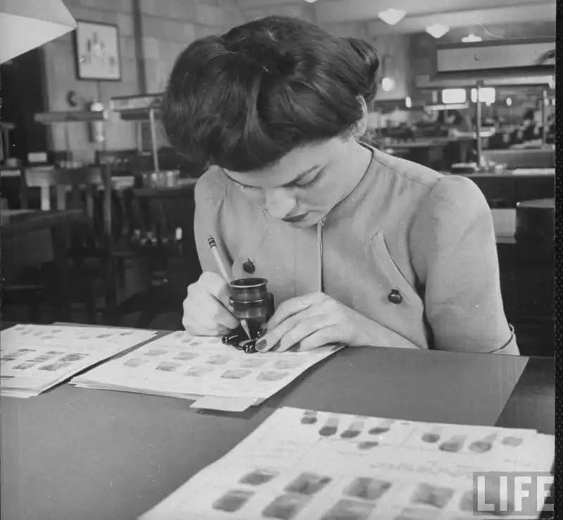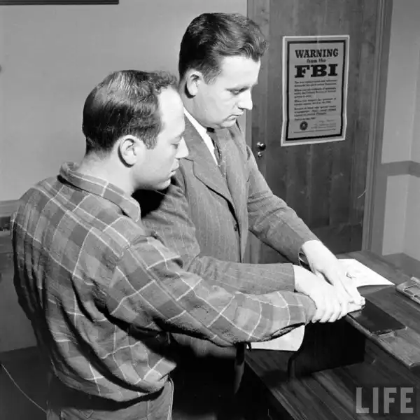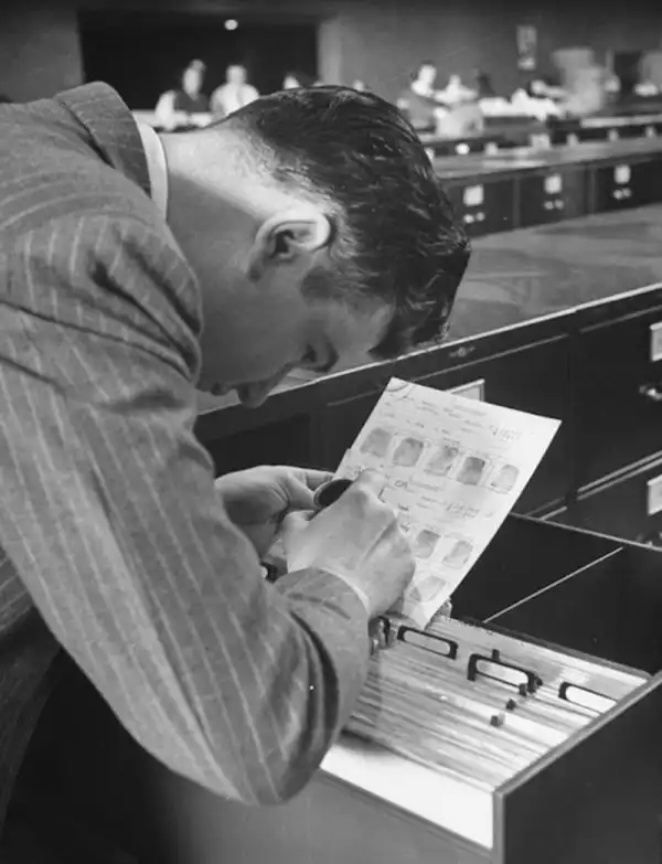 На снимках: Центральная дактилоскопическая библиотека ФБР 40-х годов. Самая крупная на то время да и в последующие годы база отпечатков пальцев в мире, созданная директором Гувером. Колоссальный архив, в котором работало 20000 человек, содержал в 1943 году порядка 70 млн. карточек. Он неуклонно рос, и к 1956 году эта картотека насчитывала уже 141 231 713 записей.