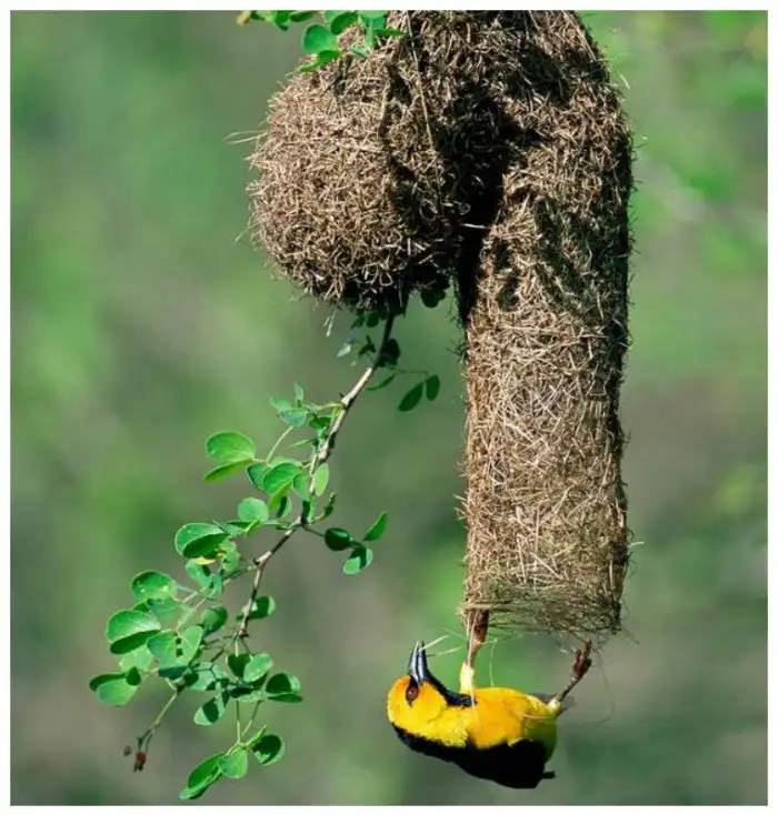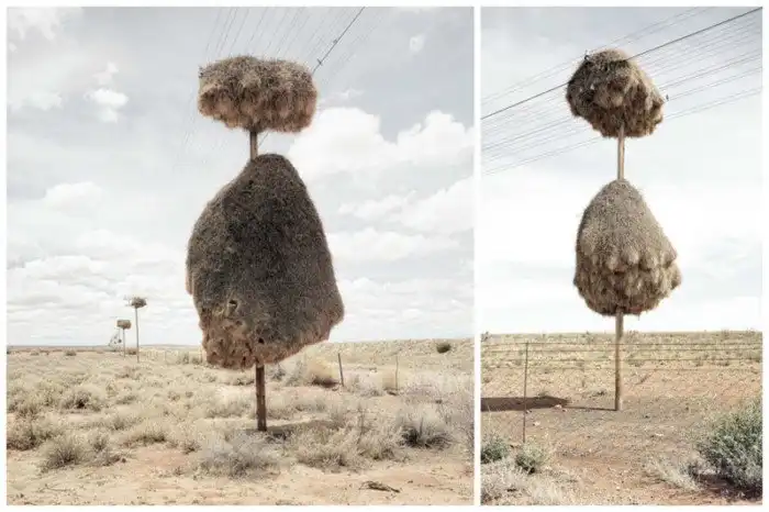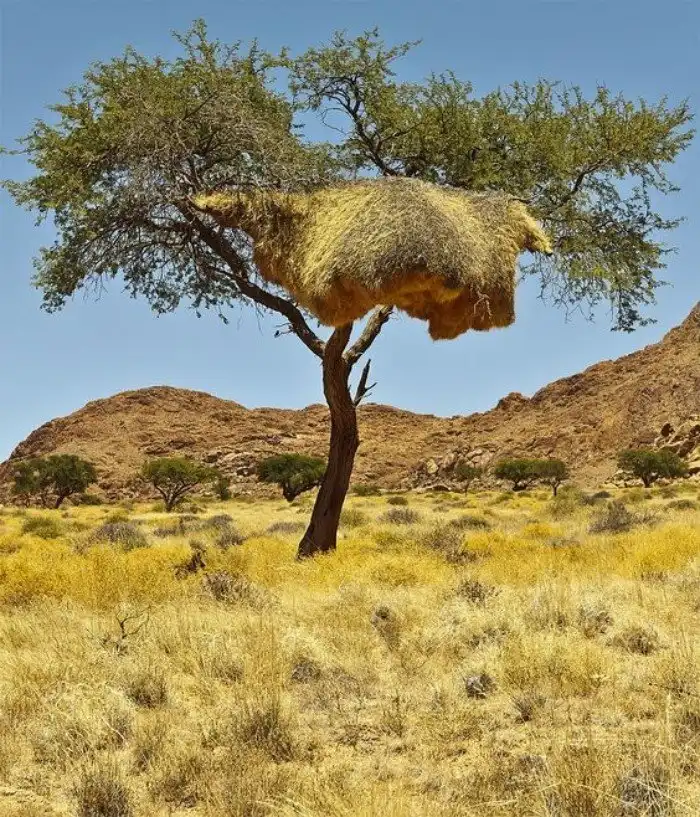 Птицы-ткачи, живущие в пустыне Калахари, плетут необычные гнезда огромных размеров.