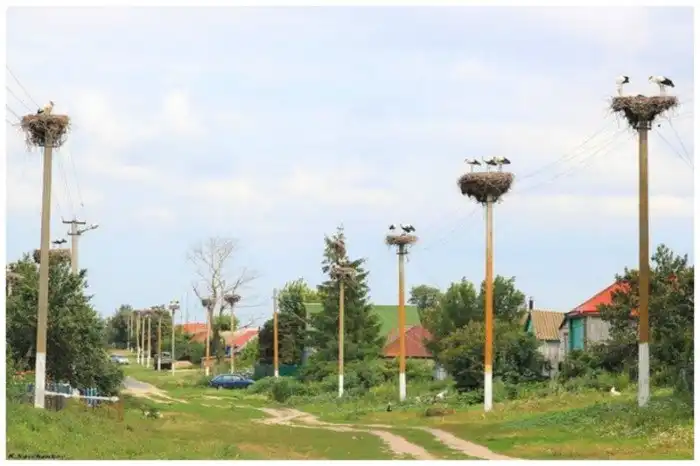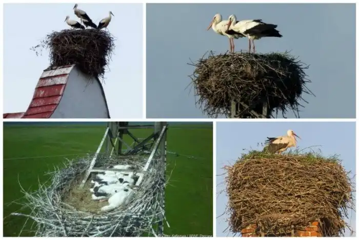 Аисты устраивают свои гнезда на опорах электропередач, на трубах, крышах домов, предпочитают селиться поближе к людям.