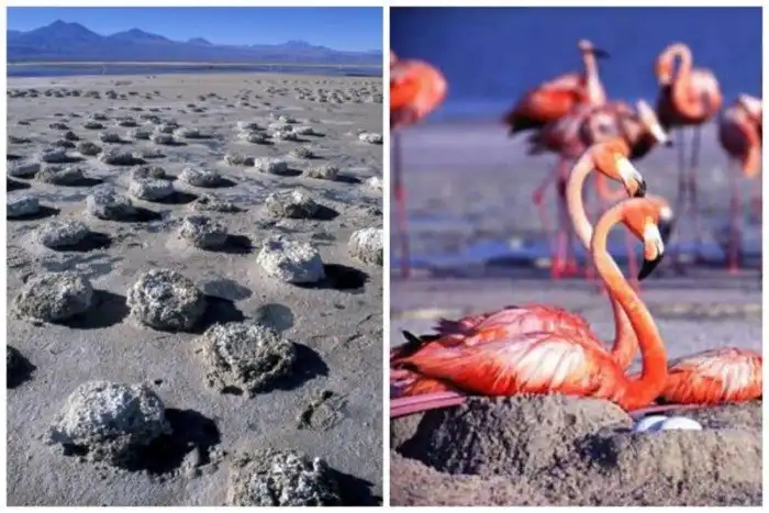 Фламинго строят гнезда в виде илисто-грязевых кочек.