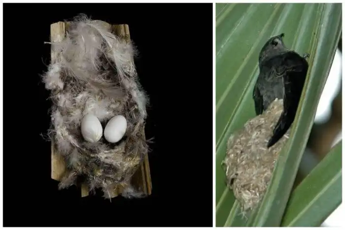 Интересное гнездо у пальмового стрижа - он приклеивает на полоску слюны, снизу пальмового листа, несколько перьев и к ним также слюной приклеивает яйца, после того, как вылупятся птенцы они все время цепляются за подстилку и прижимаются грудью к лист