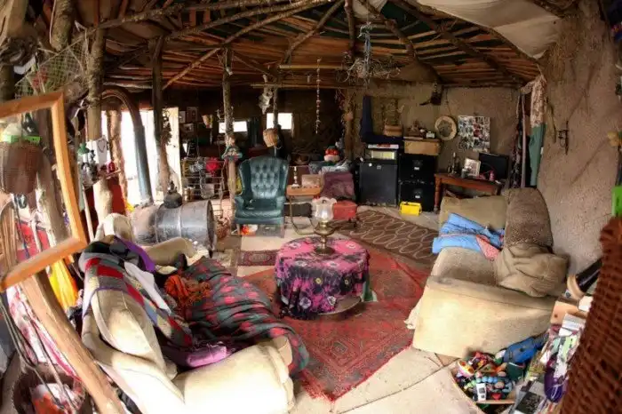 На постройку дома с кухней, гостиной, двумя спальнями и наружным компостным туалетом паре понадобилось 6 недель. Хижина укрыта торфом, а стены отделаны известковым раствором.