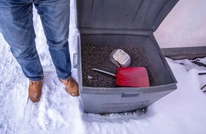 Ещё возле подъезда стоит пластиковый бак с мелкими камешками и совком. Если скользко, можно посыпать дорожку и твои соседи не поскользнутся.