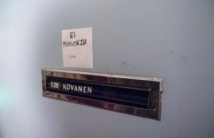 Почтовые ящики расположены прямо в двери. На ней же есть номер квартиры и фамилия жильцов. На стикере написано “Не кладите рекламу, пожалуйста”.