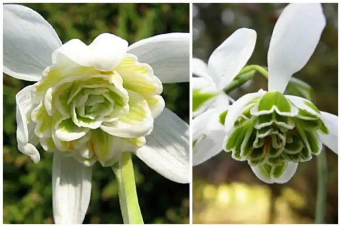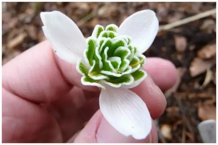 Сорт подснежника белоснежного "Anglesey Abbey". Его еще зовут сумасшедшим подснежником, т.к. его лепестки могут неожиданно стать зелеными
