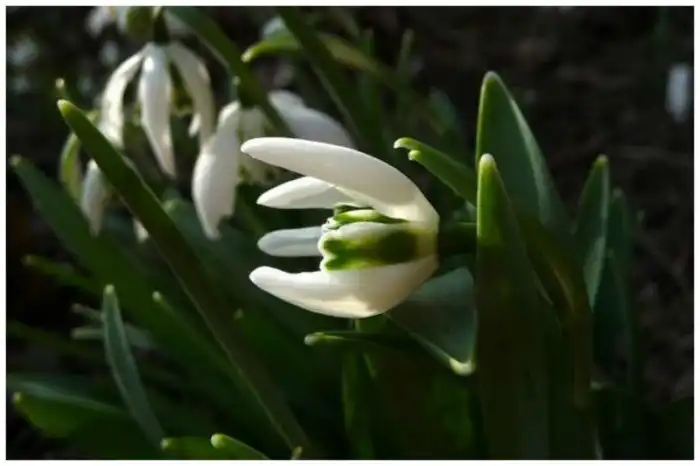 Подснежник Воронова (Galanthus woronowii) - растение с широкими листьями и небольшими белыми цветками, внутренние лепестки которых как будто заштрихованы зеленым.