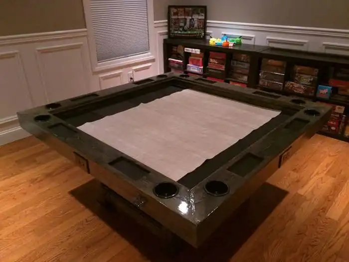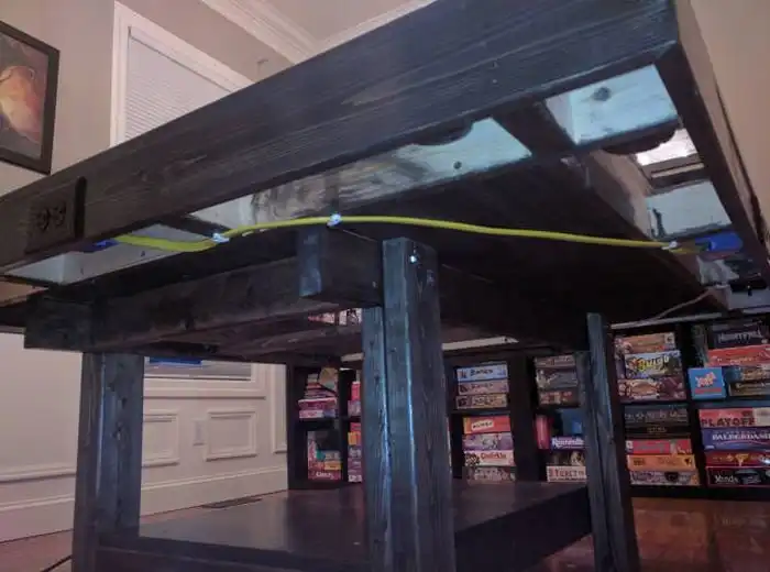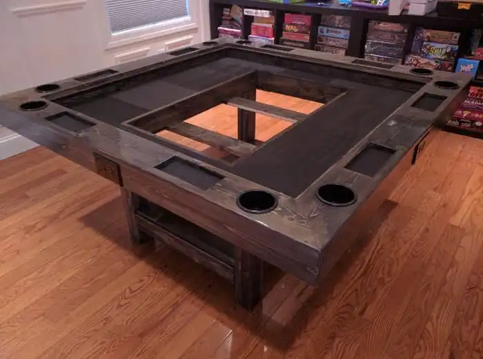 Перед вами стол, который собрал один пользователь сети, питающий большую страсть к настольным играм. Для того чтобы сделать игры с друзьями более увлекательными и интересными парень решил установить в игровой комнате специальный стол, в основу которого лег 40-дюймовый телевизор. Стол из сосны получил также подстаканники, ниши для игровых принадлежностей, а также сдвижную поверхность, скрывающую телевизор.