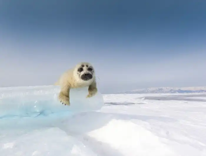 Кумай – щенок байкальской нерпы совершает свое первое путешествие по льду в окрестностях логовища.