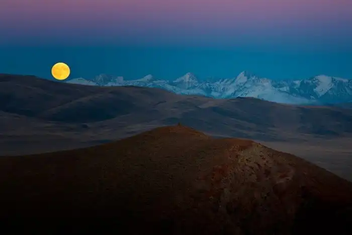 Кош-Агачский район Республики Алтай. Место, где я влюбился в закатный свет и краски, подобные рериховским картинам. Полная Луна восходит в закатном свете из-за Сайлюгемских гор. С. Кокоря, Алтай.
