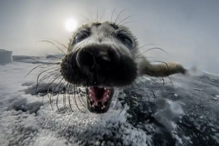Фотография сделана зимой на озере Байкал. Молодая нерпа погналась за своим отражением в объективе фишай. Город Северобайкальск, Бурятия.