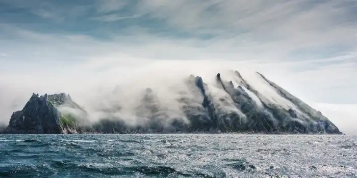 Вид с воды на остров Рейнеке, Хабаровский край. Фотография сделана в ходе морской экспедиции с севера Сахалина на Шантарские острова. Остров служит памятником природы местного значения. Город Тугур, Хабаровский край.