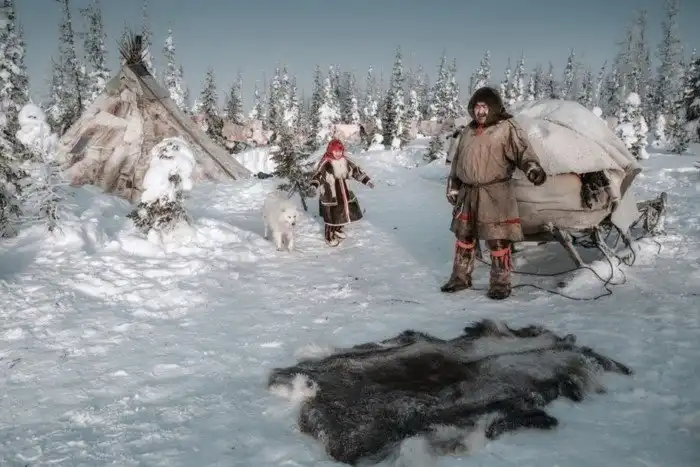 Кочевники тундры у своего чума. Город Салехард, Ямало-Ненецкий АО, полуостров Ямал, февраль 2016.
