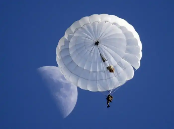 Кадет школы имени генерала Ермолова во время выполнения первого прыжка с парашютом на фоне Луны. Новомарьевская, Ставропольский край.
