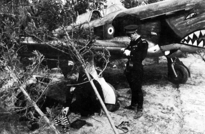 Французские летчики 1–го отдельного истребительного авиаполка сражающейся Франции "Нормандия–Неман" играют в шахматы под крылом Як–1 Ролана де ля Пуапа, 1943 год.