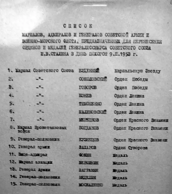 Список генералов и адмиралов, несших награды Сталина в день похорон 9 марта 1953 года.