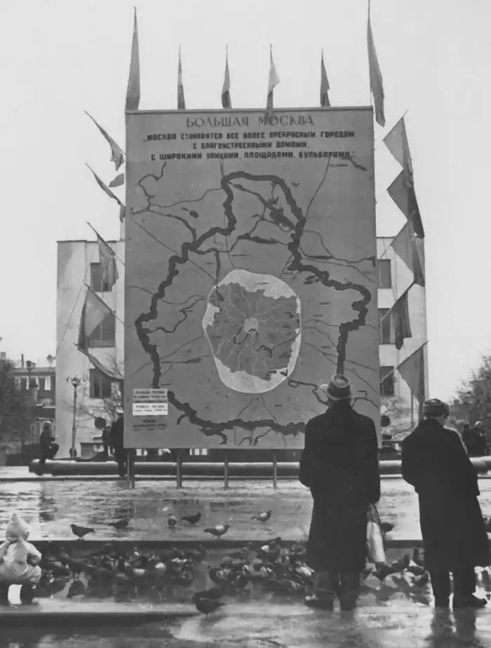 Прохожий рассматривают карту с новой и перспективной территорией Москвы, 1960 год.