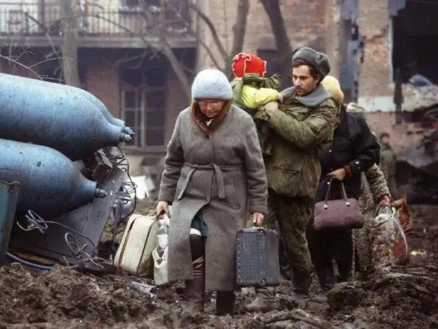 Российский военнослужащий помогает жителям Грозного, свой бронежилет солдат одел на ребенка. Январь 1995 года.