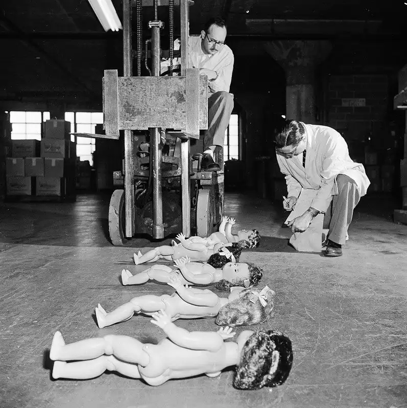 Workers stress-test dolls at a factory in Long Island. 1955.