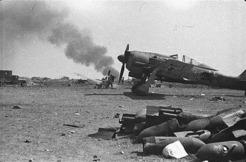 Немецкий штурмовик Фокке-Вульф Fw.190 из 2-й группы 2-й эскадры непосредственной поддержки войск (II./SG2), захваченный на херсонесском аэродроме во время боев за освобождение Крыма. На заднем плане - истребитель Мессершмитт Bf.109.