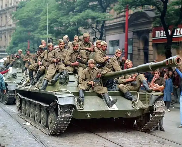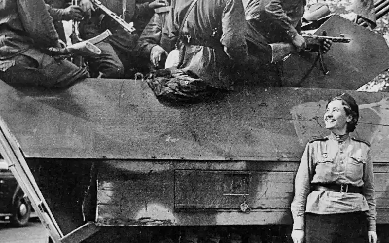 Советская военнослужащая позирует у бронетранспортера с красноармейцами в Германии