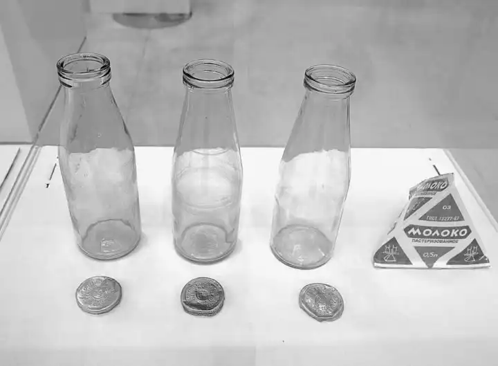 «Бронзу» нашего списка получает молочная продукции в таре с широким горлышком. Вместо привычных сегодня пластиковых упаковок в Советском Союзе использовалась стеклянная тара высокой прочности. Кефир, ряженка, сыворотка, молоко – эти и другие молочные продукты разливали в бутылки с широким горлышком. Вместо крышки использовалась фольга, где была вся информация о продукте.