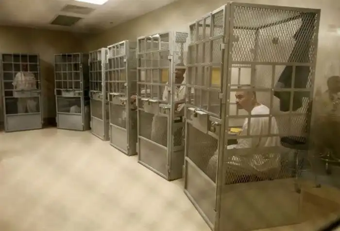 Эта тюрьма в Калифорнии предназначена для преступников, совершивших убийства или иные преступления с особой жестокостью, приговоренных к очень большим или пожизненным срокам. Они целыми днями сидят в таких прозрачных будках: охрана чувствует себя спокойно лишь тогда, когда их подопечные заперты в клетке.