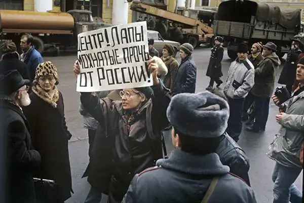 Одинокий демонстрант-коммунист, идущий по усыпанной камнями улице после кровопролитного столкновения с правоохранительными органами,1993 год