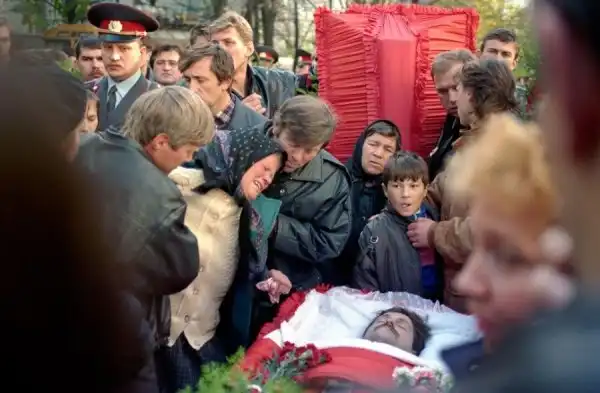 Мать рыдает на похоронах сына, бойца элитного российского спецподразделения ОМОН, убитого в октябре 1993 годя во время захвата преданными Ельцину вооруженными силами здания Парламента.