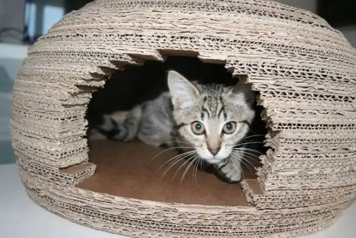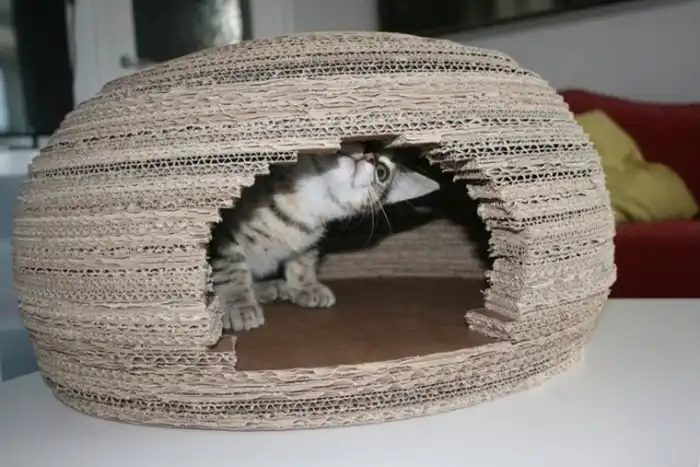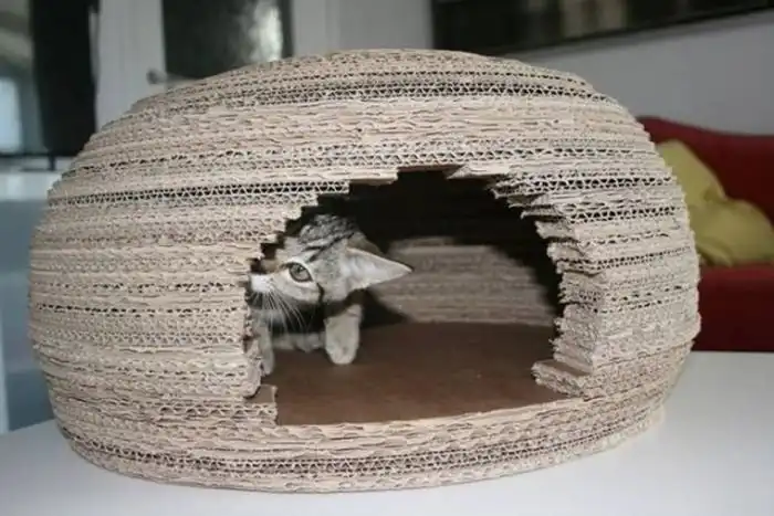 После того как в доме Мишель Денемостье появилась кошка по имени Йоко, девушка решила сделать для нее отдельный домик в стиле иглу. Для этого хозяйке животного понадобился картон, простые канцелярские принадлежности и импровизированный циркуль. Вырезав 45 картонных кругов толщиной 8 мм, девушка просто склеила их друг с другом и оставила сохнуть на сутки. После этого Йоко тут же справила новоселье в своем новом домике. О последовательности проделанной работы расскажет небольшой фотоотчет.