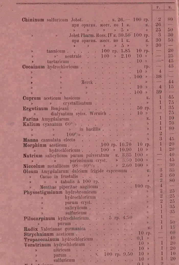 Прейскурант на кокаин, 1900 год. 38 рублей за 100 грамм