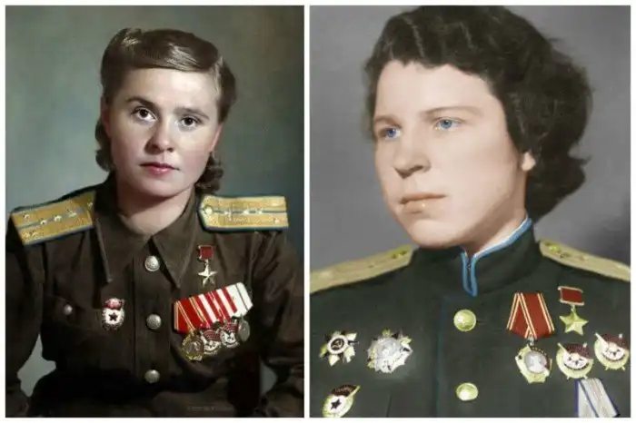 Женщины летчицы- ГСС - Герой Советского Союза Марина Долина (летчица, более 70-ти боевых вылетов) и Майор Евдокия Андреевна Никулин, командир эскадрильи 46-го гвардейского ночного бомбардировочного полка, Герой Советского Союза.