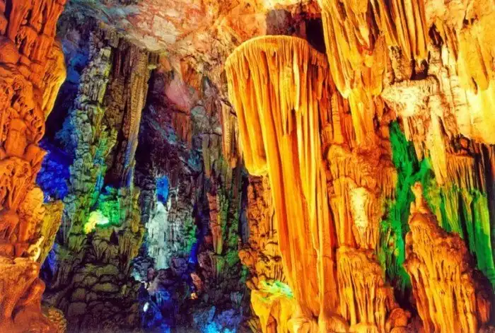 Пещера тростниковой флейты находится в Китае. В окрестностях росло море зеленого тростника — бамбука.Из него изготовляли не что иное, как флейты. Существует легенда, что эту пещеру нашел обычный крестьянин, который во время работы просто провалился в расщелину под землей. Так сказать, сам того не ожидая и о таком не мечтая, он попал в сказочный рай.